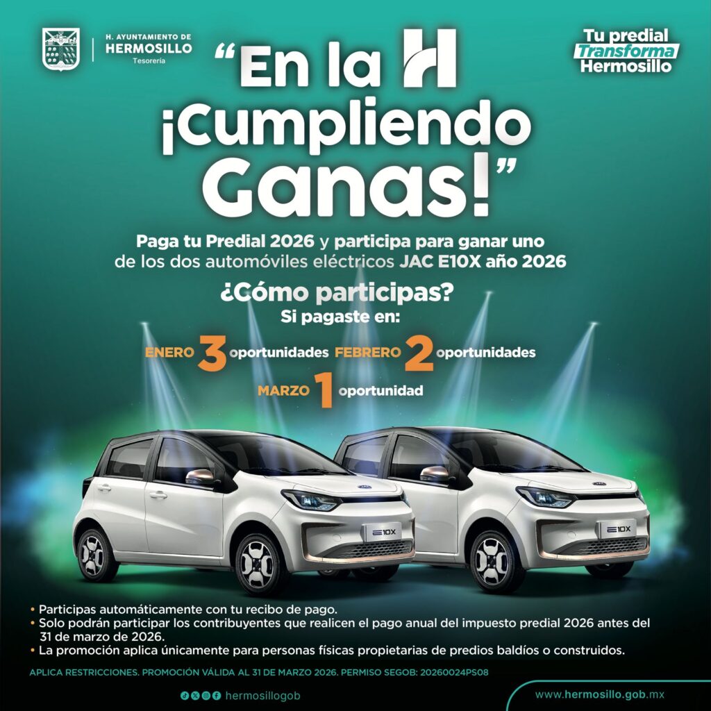 Hermosillo, Sonora; 13 de abril, 2026.-El próximo martes 28 de abril será el gran sorteo de dos carros eléctricos ¡En la H, Cumpliendo Ganas!, y a partir del 15 de abril estarán disponibles los folios con los que participarán todos los contribuyentes que pagaron su predial de enero a marzo de 2026.